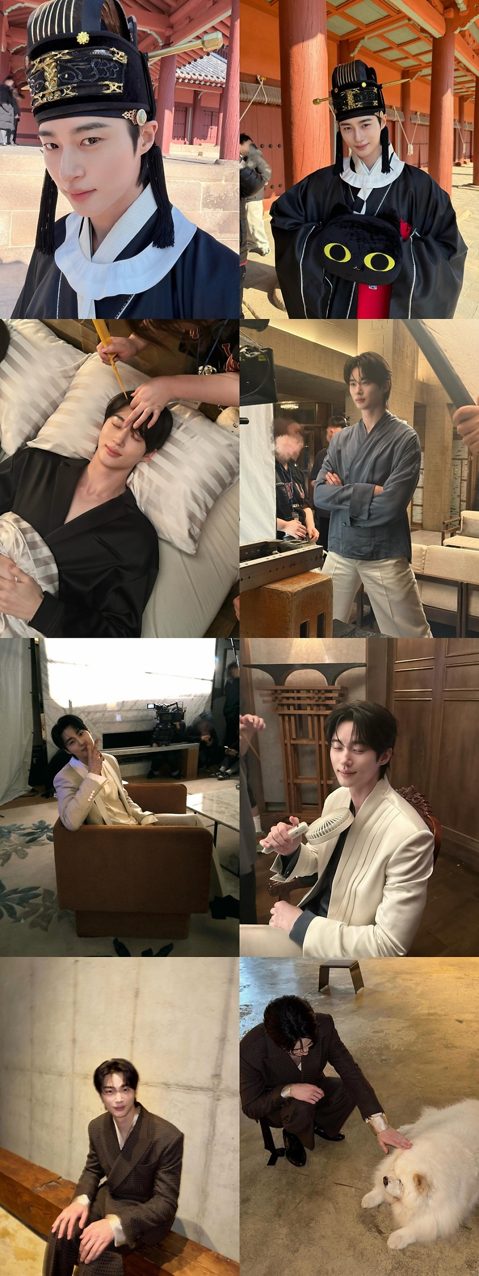 한복 예복을 차려입은 채 늠름한 자태를 보여주다가도, 검은 고양이 쿠션을 꼭 껴안고 브이 포즈를 취하는 귀여운 모습이 포착됐어요.