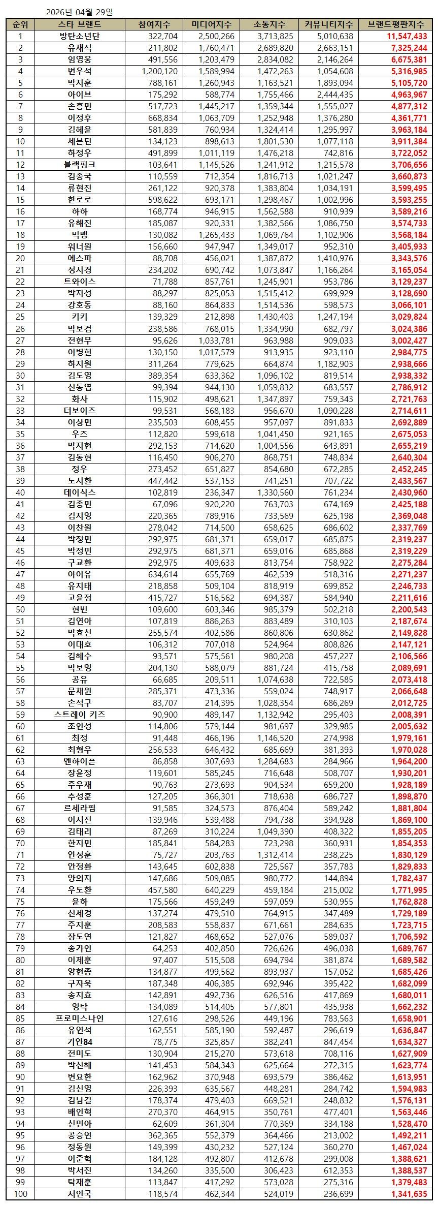 2026년 4월 스타 브랜드평판 결과가 나왔는데요.