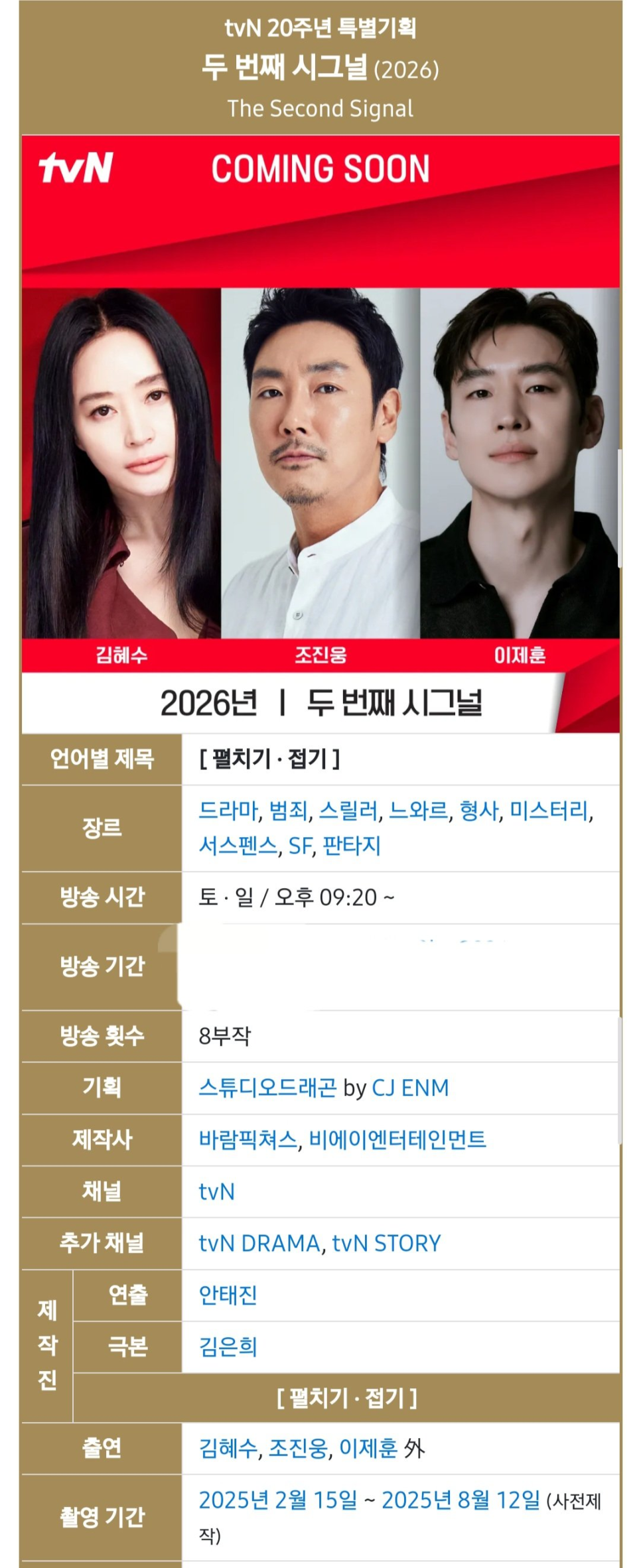 지난 4월 17일, tvN은 두 번째 시그널 의 6월 및 하절기 편성을 최종 제외했다고 전해졌어요.